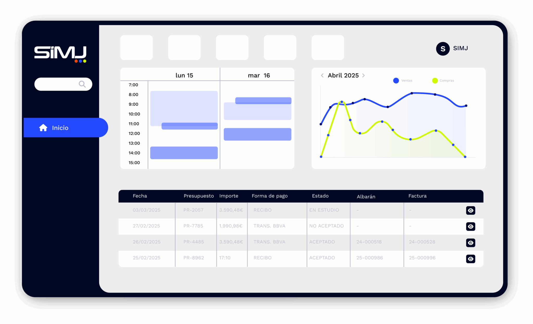 Control de presupuestos, compras, ventas y almacén.